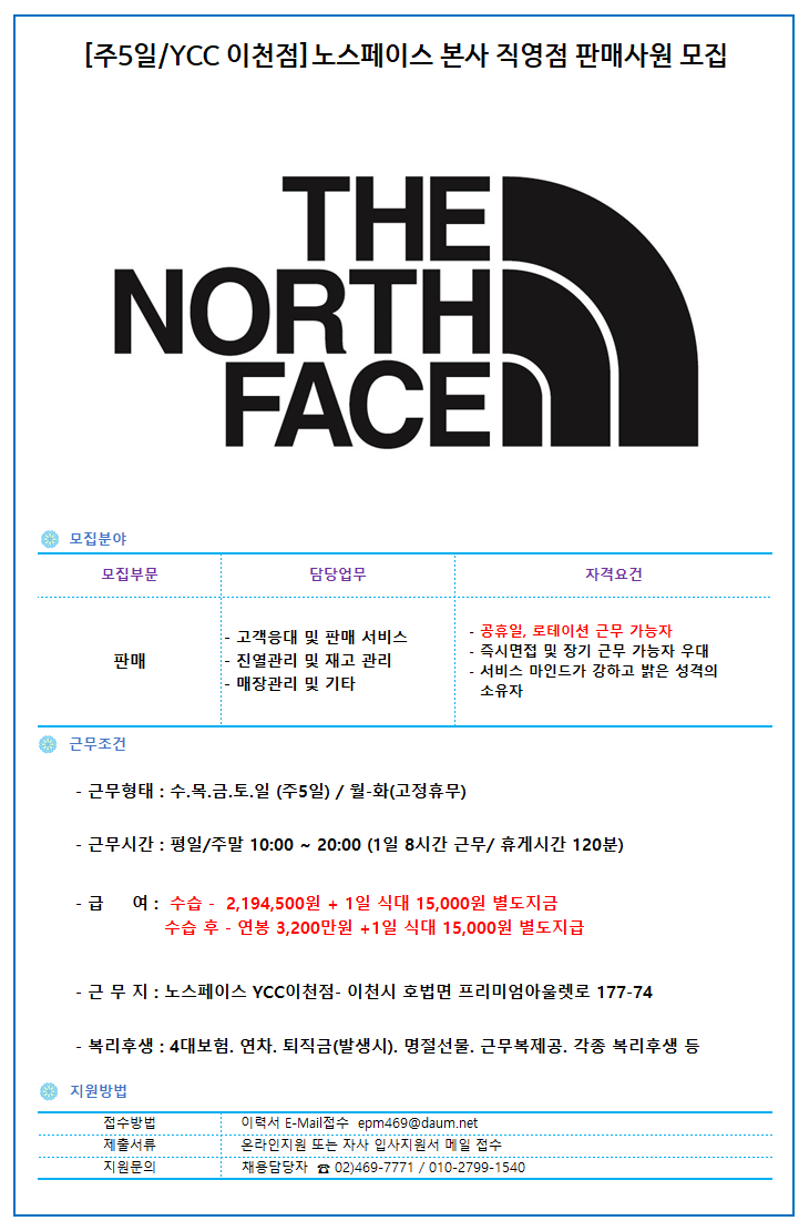 [주5일/ycc 이천점]노스페이스 본사 직영점 신입 및 경럭 모집